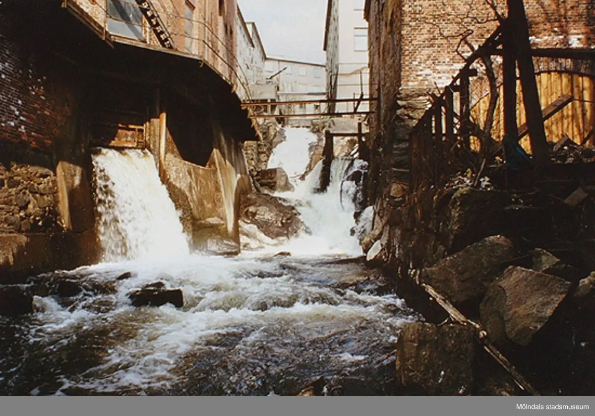 Vy nerifrån Mölndalsfallen österut, okänt årtal. Närmast till vänster ses "F-fabriken" (Kvarnfallet 10) med delar kvar från tidigt 1800-tal.
