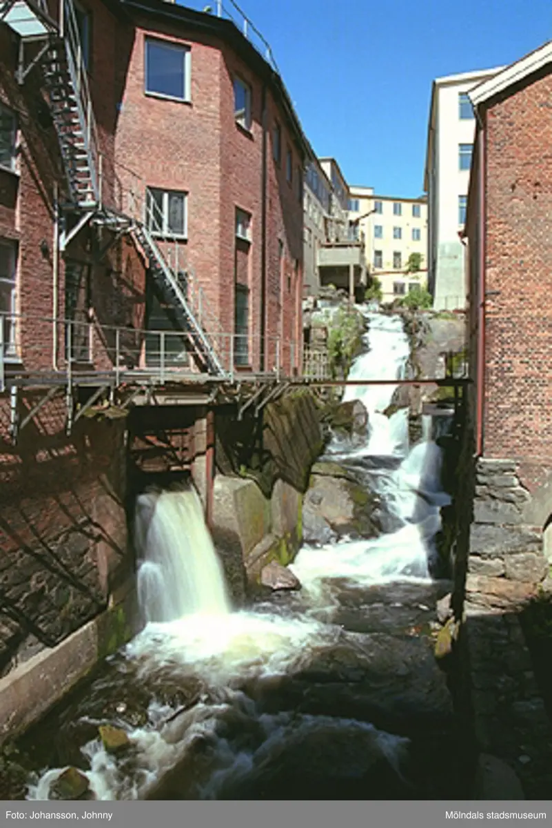Mölndalsfallen sett nerifrån, år 1999. Närmast till vänster: Kvarnfallet 10 (F-fabriken/Oljeslageriet).