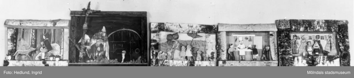 Bosgårdens barnträdgård 1938-1945. Fem tittskåp med sagomotiv. Dessa hade gjorts av förskolläraren Ingrid Hedlund och användes i den pedagogiska undervisningen.