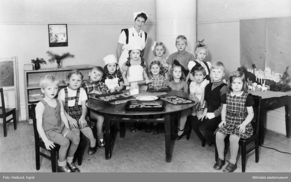 Bosgårdens barnträdgård 1938-1945. Fröken och barn som står uppställda bakom ett runt bord inför fotografering.