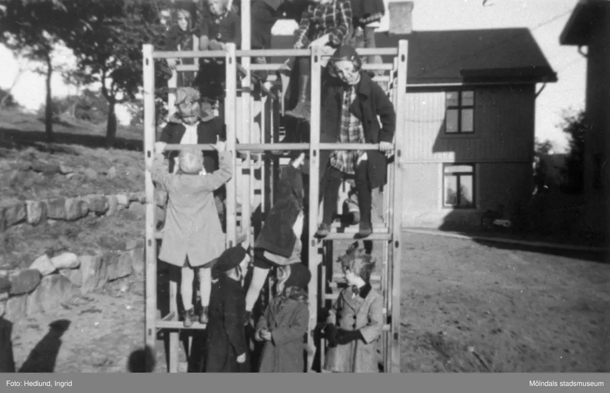 Bosgårdens barnträdgård 1938-1945. Barn i en klätterställning. I huset i bakgrunden började lekskolan.
