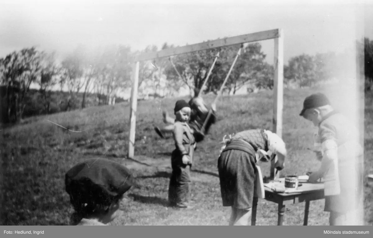 Bosgårdens barnträdgård 1938-1945. Fem barn vid en gungställning. Ett av barnen gungar, två av dem målar vid ett bord.
