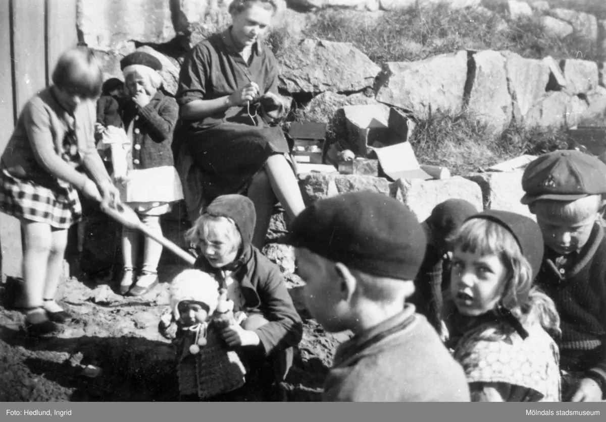 Bosgårdens barnträdgård 1938-1945. Förskollärare och barn som leker utomhus.