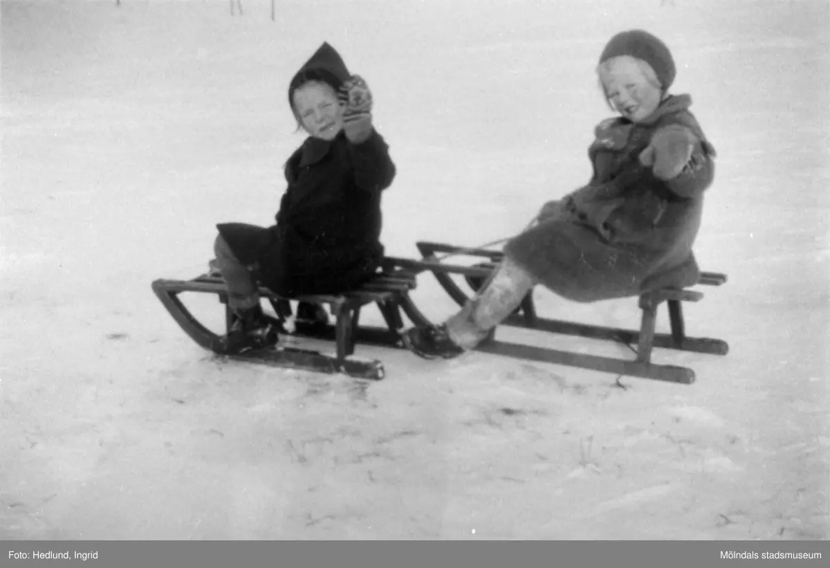 Bosgårdens barnträdgård 1938-1945. Två flickor på kälkar.