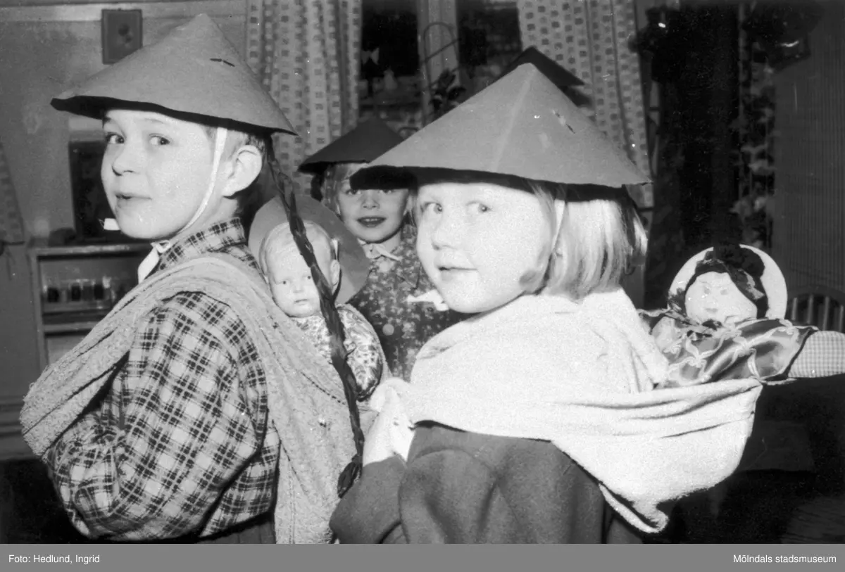 Bosgårdens barnträdgård 1938-1945. Barn som leker "kineser" De har "kinahattar" och dockor på ryggen. Del i ett teaterstycke?