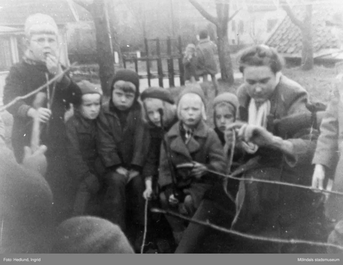 Bosgårdens barnträdgård 1938-1945. Fröken och barn som grillar korv utomhus.