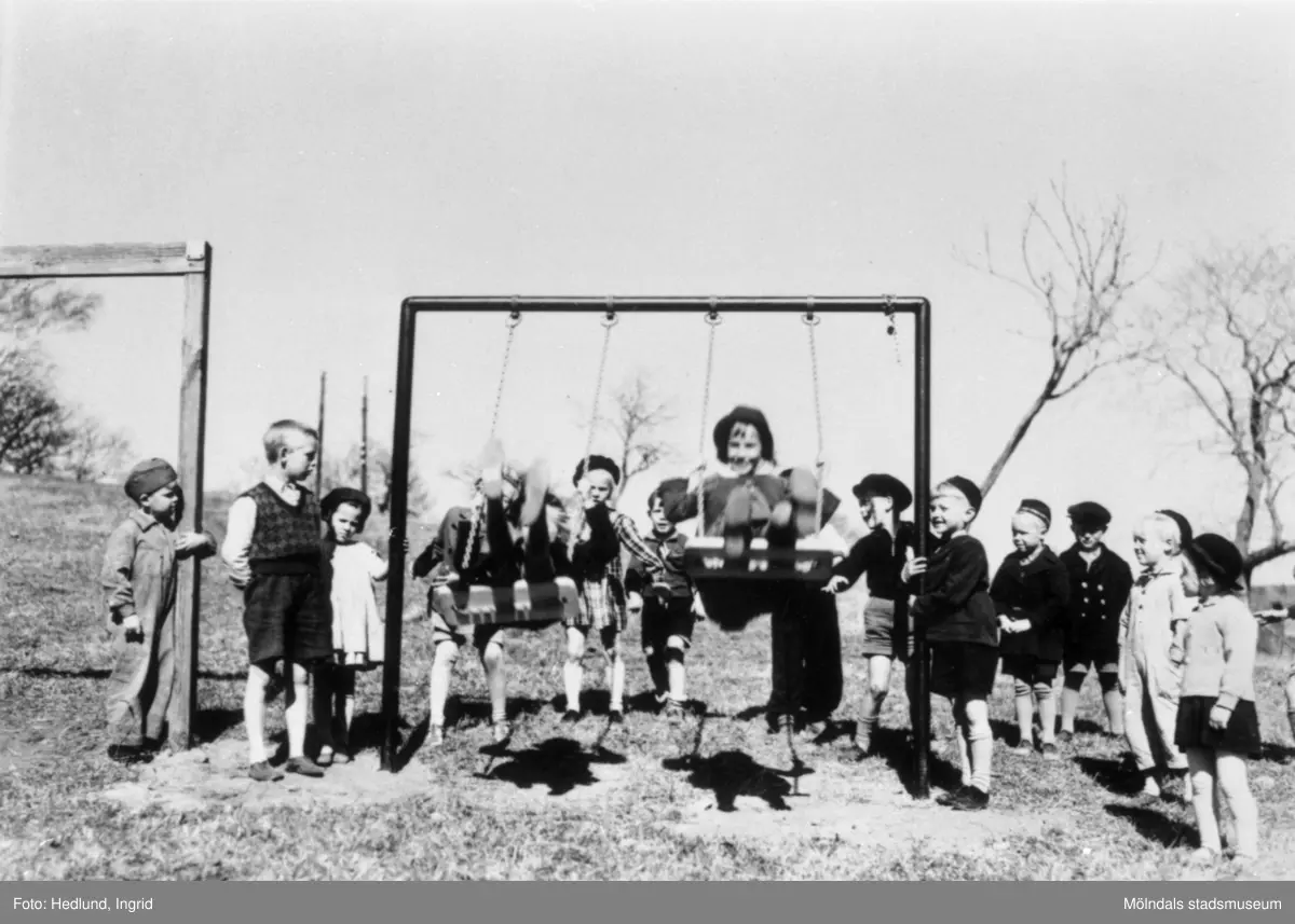Bosgårdens barnträdgård 1938-1945. Fröken och barn som står vid en gungställning.