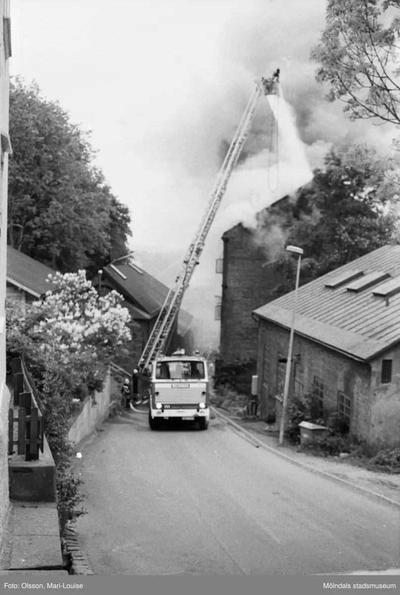 Soab-branden i Stora Götafors den 4 juni 1986. Branden bekämpas från brandbil som står på Götaforsliden.