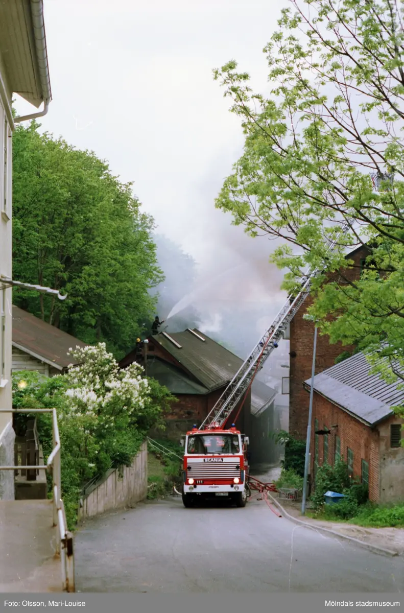 Titel: Soab-branden i Stora Götafors den 4 juni 1986. En brandbil som står på Götaforsliden.