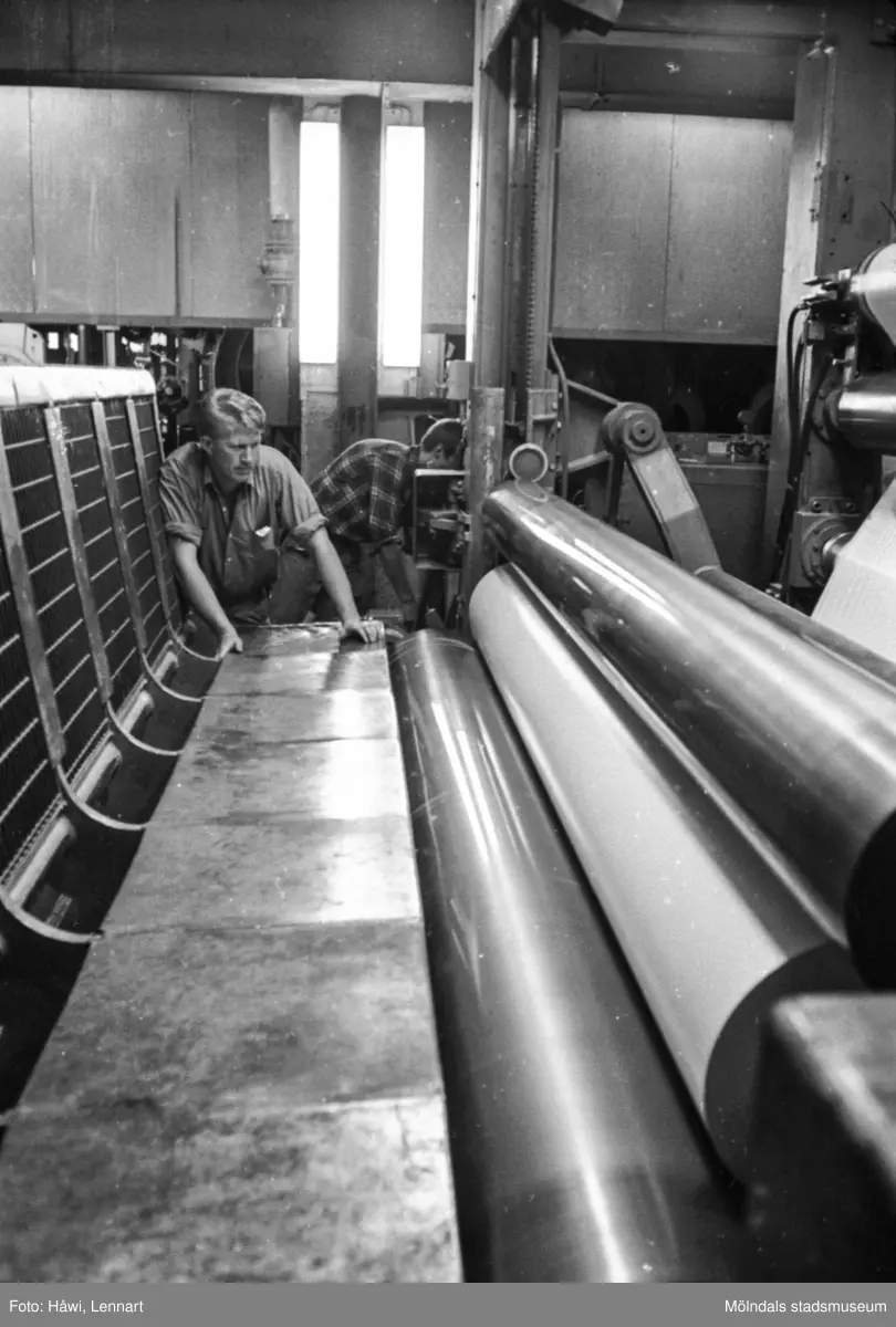 Man i arbete vid maskin på pappersbruket Papyrus, hösten 1970. Rullmaskin 5, byggnad 10. Lars Elfström, jobbade som arbetsledare.