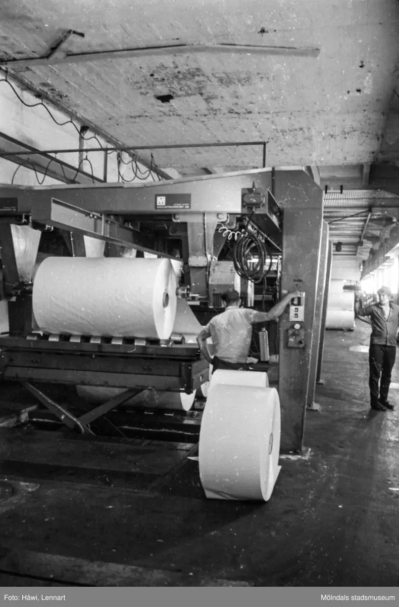 Män i arbete vid maskin. Antagligen Voldemar Mei med ryggen vänd mot kameran. Rullar läggs i klippen och klippta ark kommer ut på andra sidan av maskinen. Klipp 5 (fabrikat Masson/Mason & Scott), byggnad 10. Pappersbruket Papyrus i Mölndal, hösten 1970.