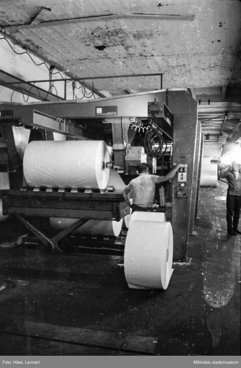 Män i arbete vid maskin på pappersbruket Papyrus i Mölndal, hösten 1970. Klipp 5 (arkmaskin), från baksidan, där man lade rullarna. byggnad 10.