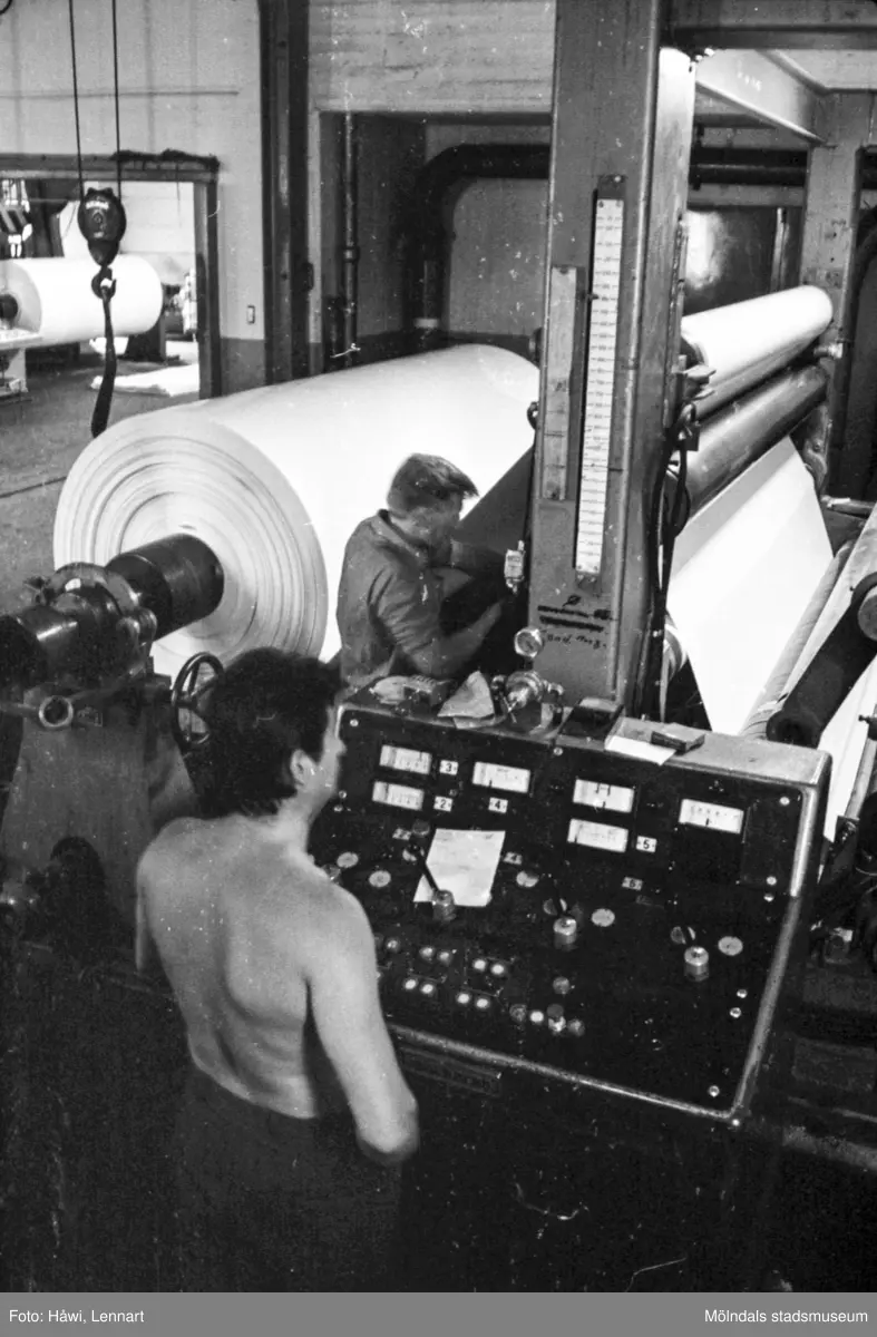 Män i arbete vid rullmaskin 5. Pappret rullas upp och skärs till rätt rullbredd. På bilden syns maskinens styrpulpet/manöverpulpet. Byggnad 10. Pappersbruket Papyrus i Mölndal, hösten 1970.