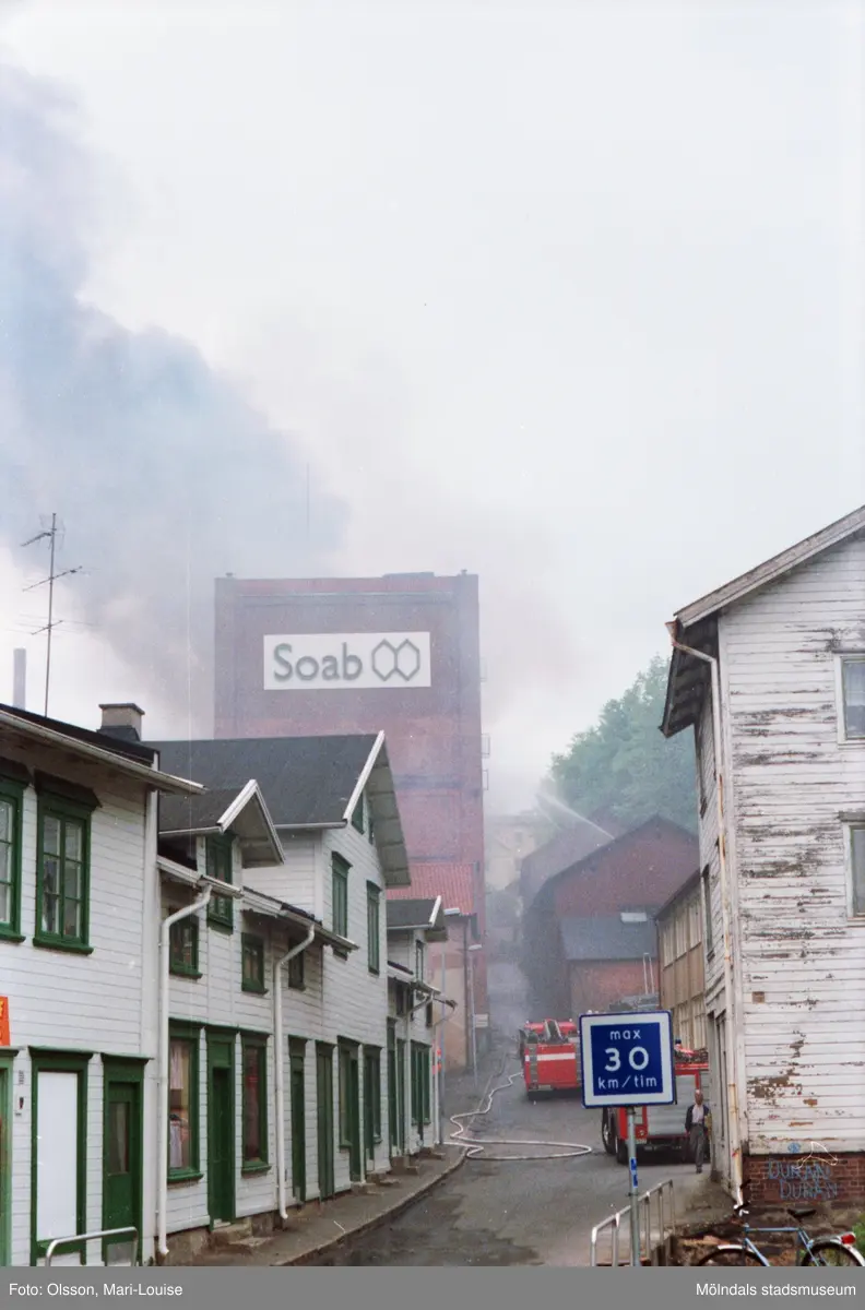Soab-branden i Stora Götafors den 4 juni 1986. Bild tagen från Götaforsliden. Kråkans Krog till vänster (vitt hus).