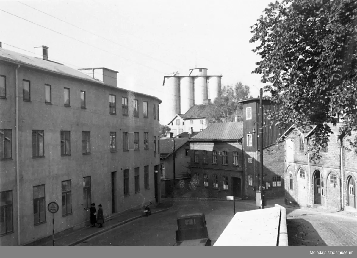 Till vänster ses Viktor Samuelsons fabrik "Strumpan" på Kvarnbygatan 10-14 omkring 1940. Soabs silotorn skymtar i bakgrunden.