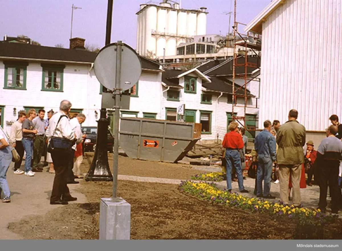 Folksamling vid Lyktplatsen i Kvarnbyn. Gatlyktan invigs på Kvarnbydagen 25/4 1993. Det vita huset rakt fram är Kråkans Krog och till höger ligger Korndal 2. I bakgrunden ses Soabs silotorn på höjden.