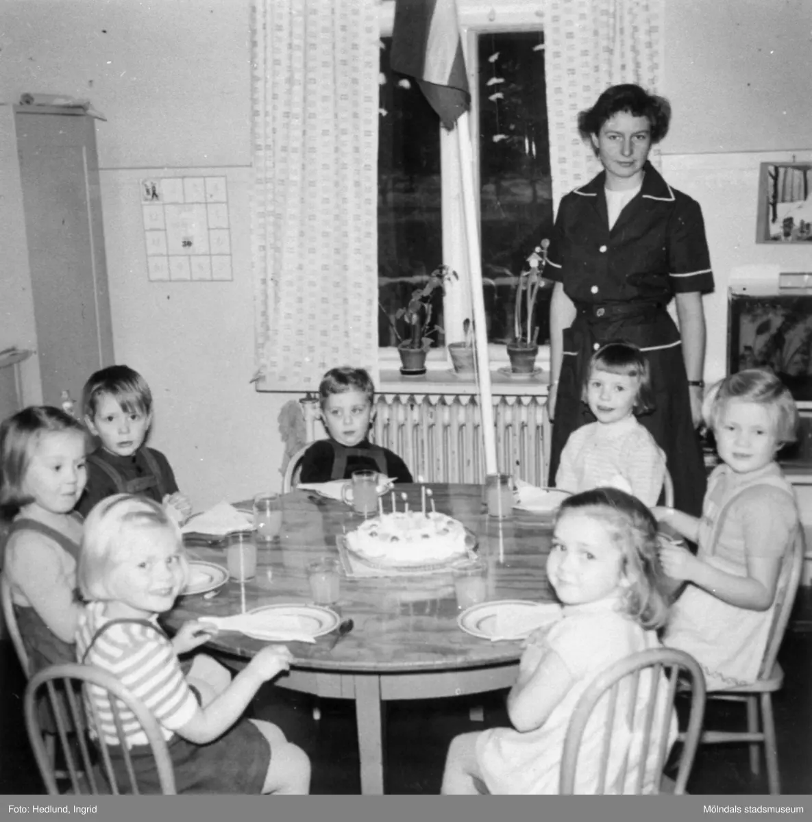 Bosgårdens barnträdgård 1938-1945. Flera barn som sitter runt ett bord med en tårta på.