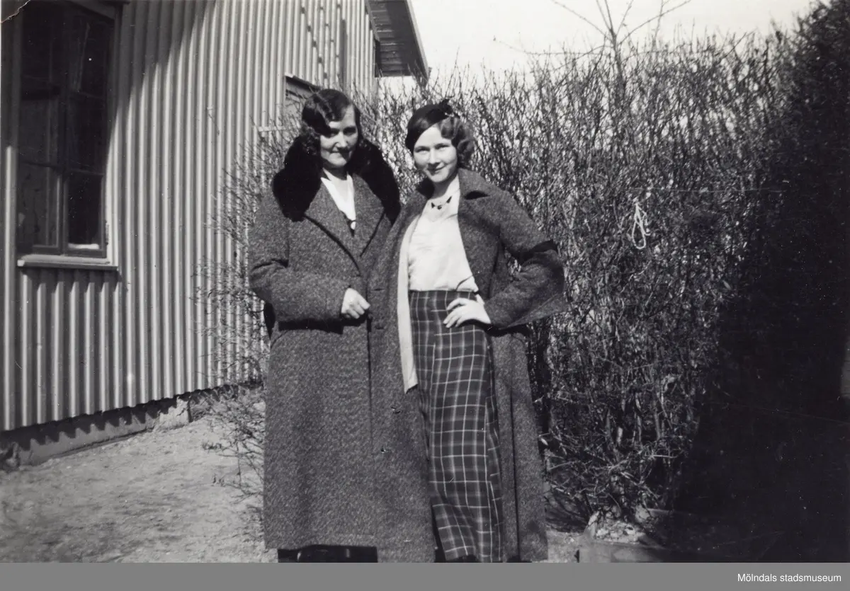 Hilda Börjesson Hallgren och Elna Börjesson fotograferade i trädgården. Fotografi ur album som tillhört Åke Börjesson.