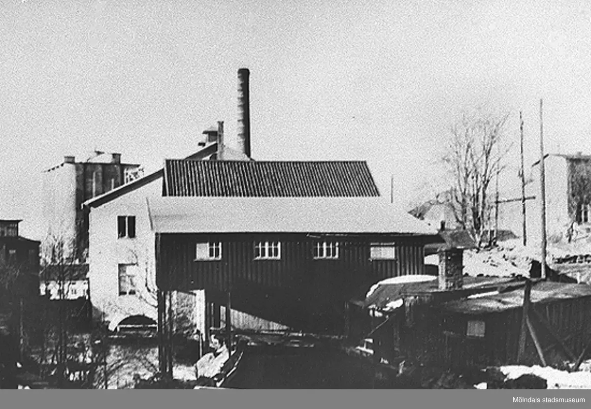 Hulans kvarn (Kvarnfallet 15), 1930-tal. I fonden till vänster skymtas Soabs silotorn. Hulans kvarn var en vattendriven kvarn som upphörde att mala år 1938. Efter det användes den som lagerlokal. Den revs 1942 när Viktor Samuelsons fabrik "Strumpan" byggdes ut.