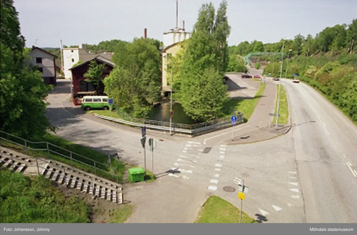 Titel: Vy från Stensjögatans bro, över forsen och på f.d strumpfabriken "Strumpan" (efter Viktor Samuelsons fabrik), år 2000. Royens gata går in till vänster, Kvarnbygatan passerar till höger och i bakgrundens mitt skymtar Soabs silotorn.