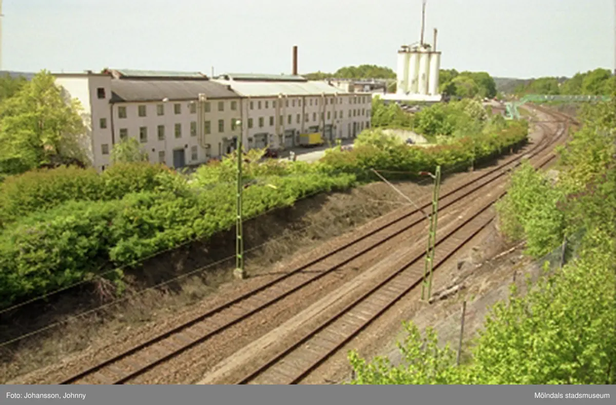 Den f.d strumpfabriken "Strumpan" (efter Viktor Samuelsons fabrik) och området omkring, år 2000. Boråsbanan ses i framkant och Soabs silotorn längre bort till höger