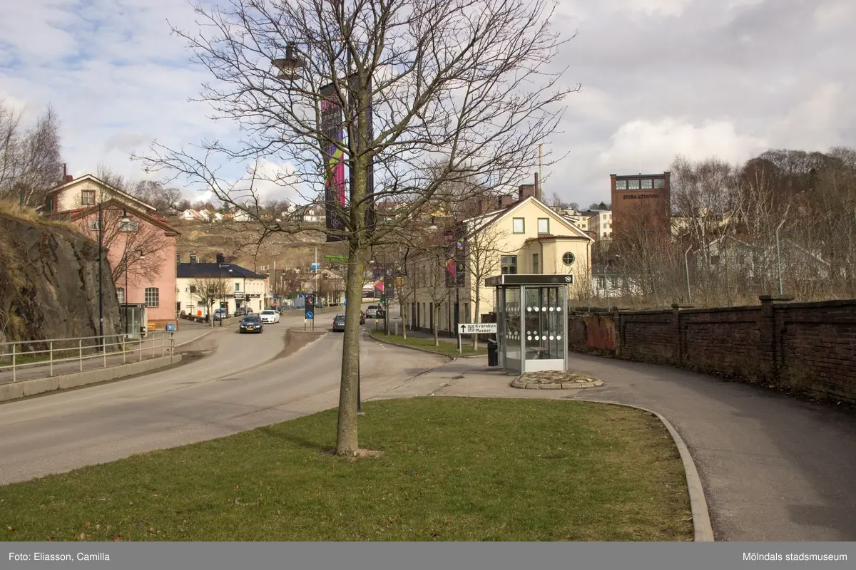 Kvarnbygatan i riktning mot öster. I bildens mitt ses Gamla Torget till vänster och Kvarnbygatan 4 (Byggnad 231) till höger. Gatan går förbi f.d Papyrus-områdets mur till vänster. I samband med denna fotografering pågick en 80-talsutställning på Mölndals stadsmuseum, 17 maj 2014 – 4 oktober 2015, vilket syns på vimplarna vid busskuren/hållplatsen "Gamla torget". Längre fram (ej i bild) börjar backen "Kråkan". I vyn till vänster ser man Gamla torget och ovanför detta nya Kvarnbyterrassen som bebyggs med bostäder. Den höga byggnaden till höger är Stora Götafors.