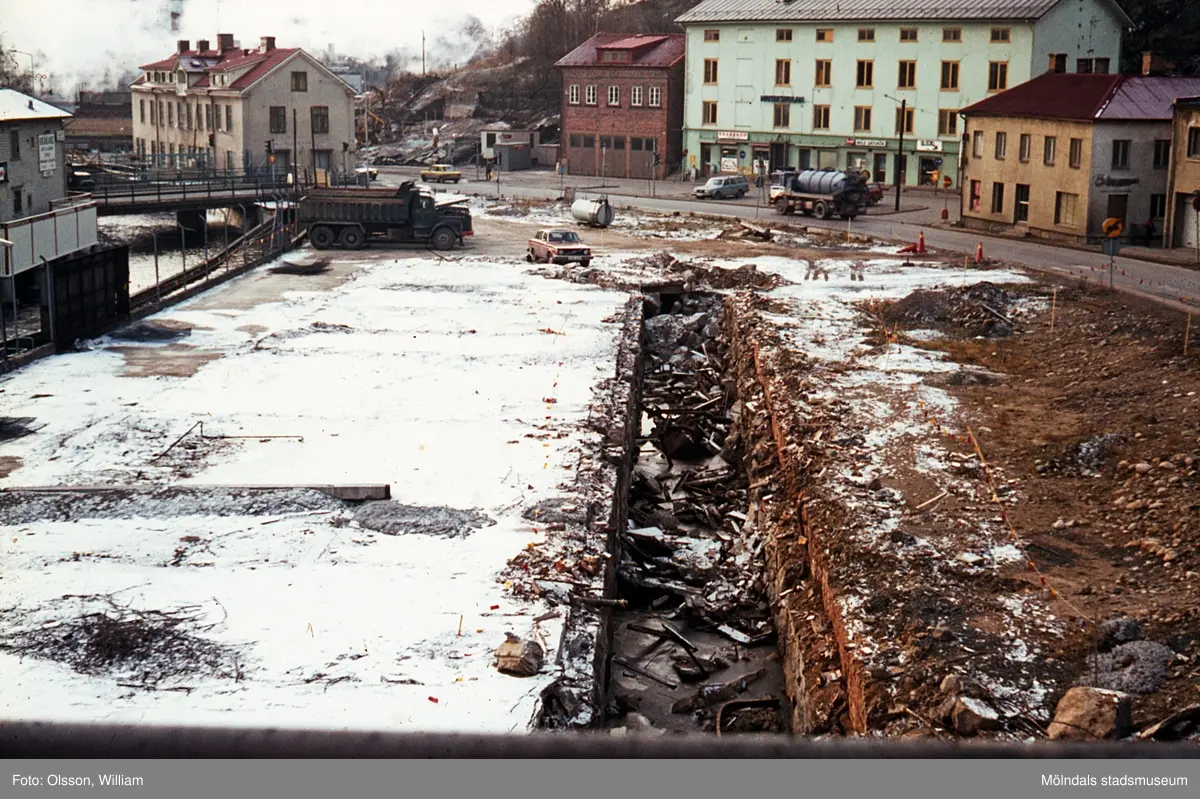 Kvarnbygatan västerut, okänt årtal. Främst ser man en rivningstomt som senare blev en breddning av Kvarnbygatan. Till vänster: skymtas Kråkans Krog och Mölndalsfallen, Forsebron samt Byggnad 213 (Kvarnbygatan 4). Till höger, nerifrån: Viktualieföreningens affär, Gamla stadshuset (senare: Kultur- och musikskolan) samt Götiska Förbundets friskola (Kvarnbygatan 49, idag: Samuel Norbergsgatan 2).