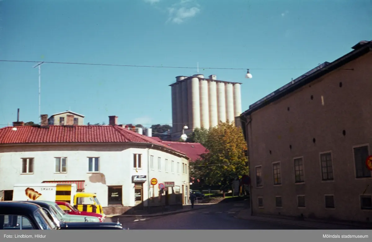 Vy från Gamla Torget i Mölndal, 1960-tal. Till vänster ses Kvarnbygatan 45, i mitten SOAB:s silotorn och till höger Kvarnbygatan 6, byggnad tillhörande SOAB.