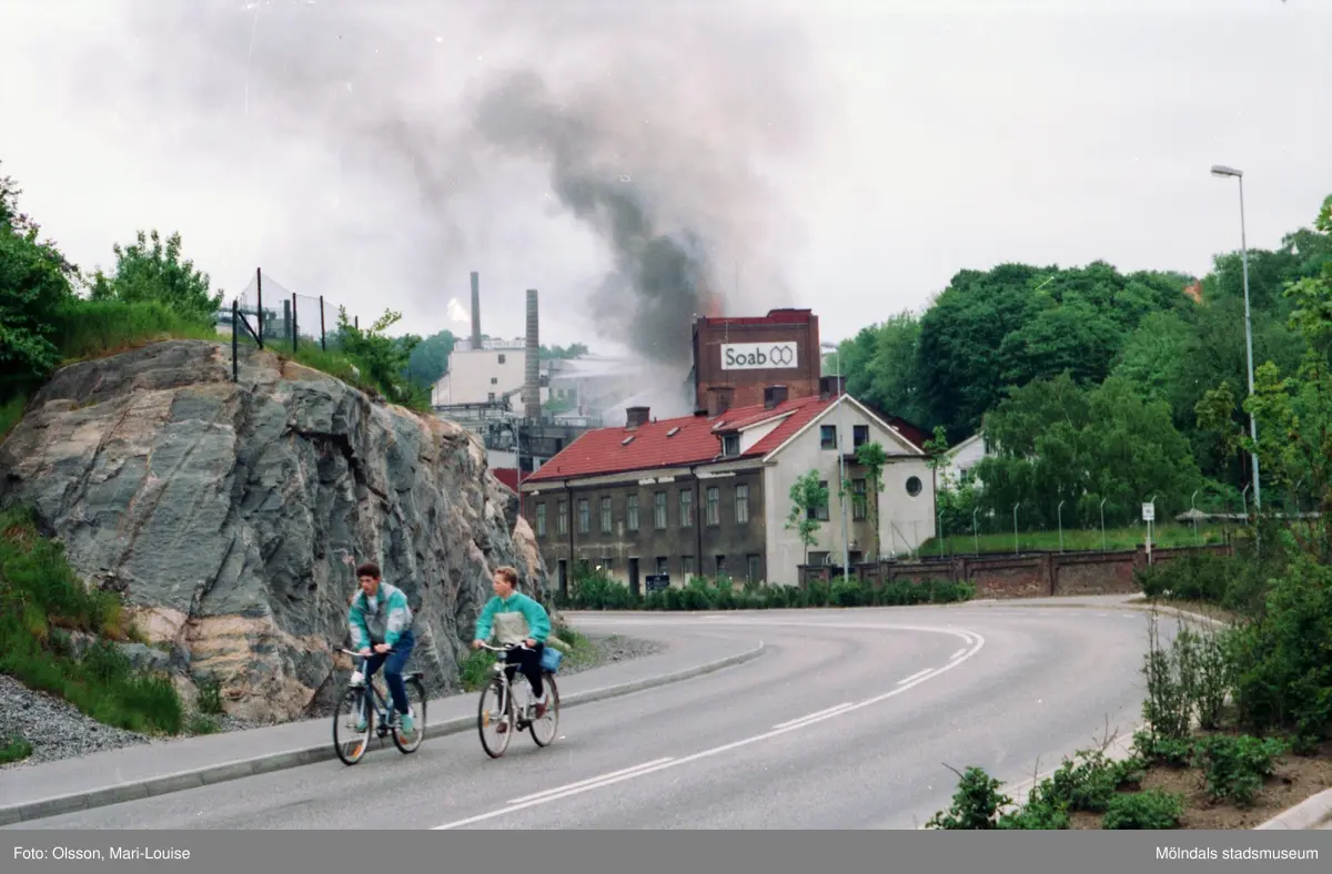 Soab-branden i Stora Götafors den 4 juni 1986. Två personer som cyklar utanför Papyrus mur.