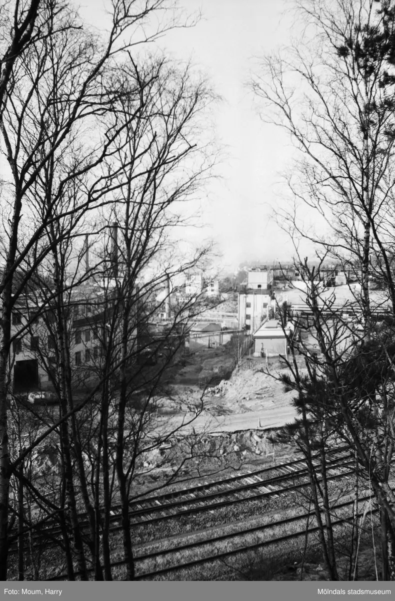 Vy över Boråsbanans järnväg på vägarbete i backen "Kråkan" (Kvarnbygatan i Mölndal), år 1984. Till vänser ses "Strumpan" (Kvarnbygatan 10-14) och till höger fabriksbyggnader tillhörande Soab.