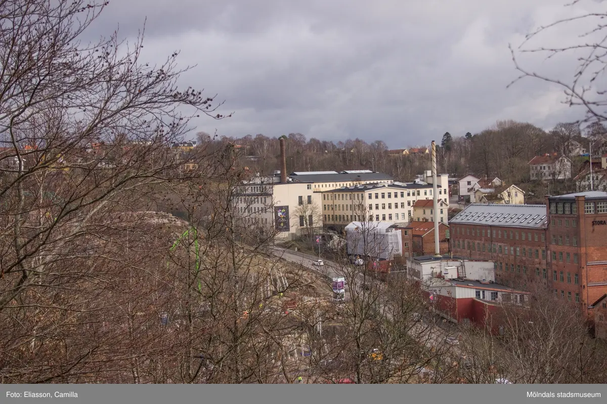 Vy från Störtfjället över Kvarnbygatan "Kråkan" i östlig riktning, år 2015. Till vänster bakom grenverket låg tidigare SOABs anläggningar. De såg stora ut från "Kråkan" men i själva verket var fabriksområdet kringskuret av Boråsbanan, Mölndalsfallen och bebyggelsen vid Gamla torget. Företaget kunde inte expandera och lade därför ner verksamheten i Mölndal år 2007. Senare byggdes bostadsområdet Kvarnbyterrassen på platsen. I den beiga byggnaden i mitten låg tidigare Samuelsons fabrik "Strumpan" (Kvarnbygatan 10-14), senare: Mölndals stadsmuseum. Nedanför ligger den höga, röda tegelbyggnaden Stora Götafors.