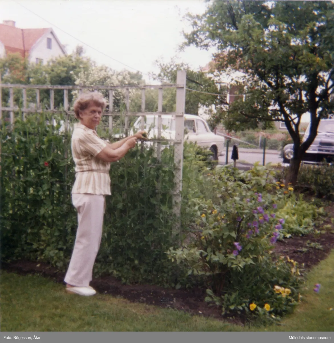 Inga-Lill Börjesson i trädgården 1978. Solhemsgatan 10 åt gatan med luktärtsspaljén och bilplatsen (Volvo PV).