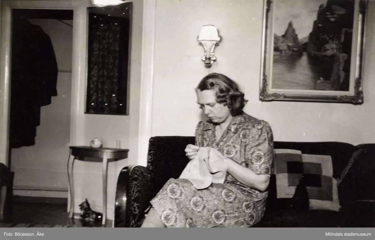 Inga-Lill Börjesson i vardagsrummet julen 1948. Hallen i bakgrunden.