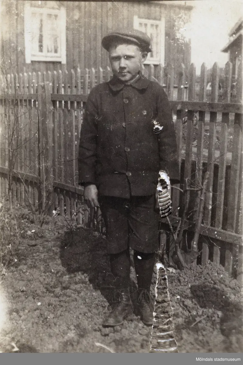 Åke Börjesson fotograferad i trädgården. Fotografi ur album som tillhört Hilda Börjesson Hallgren.