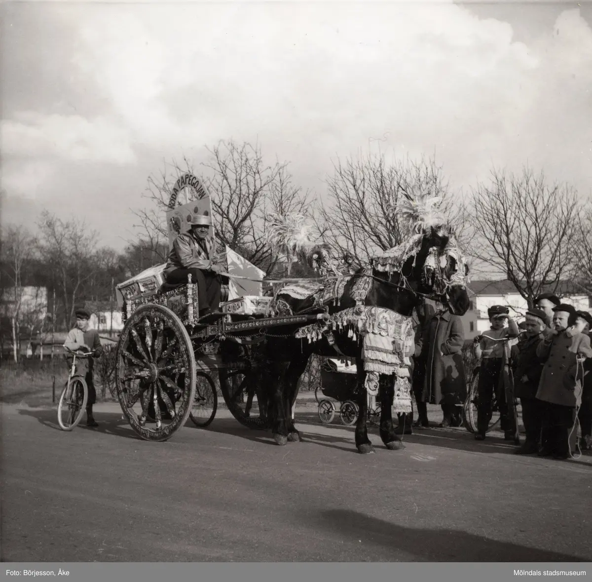 Motiv från Solängen. Häst med vagn och kusk bär dekorationer. Möjligtvis reklam av något slag? Skylt med texten "Röda papegojan" på vagnen. Barn på cyklar står runt omkring och tittar på.