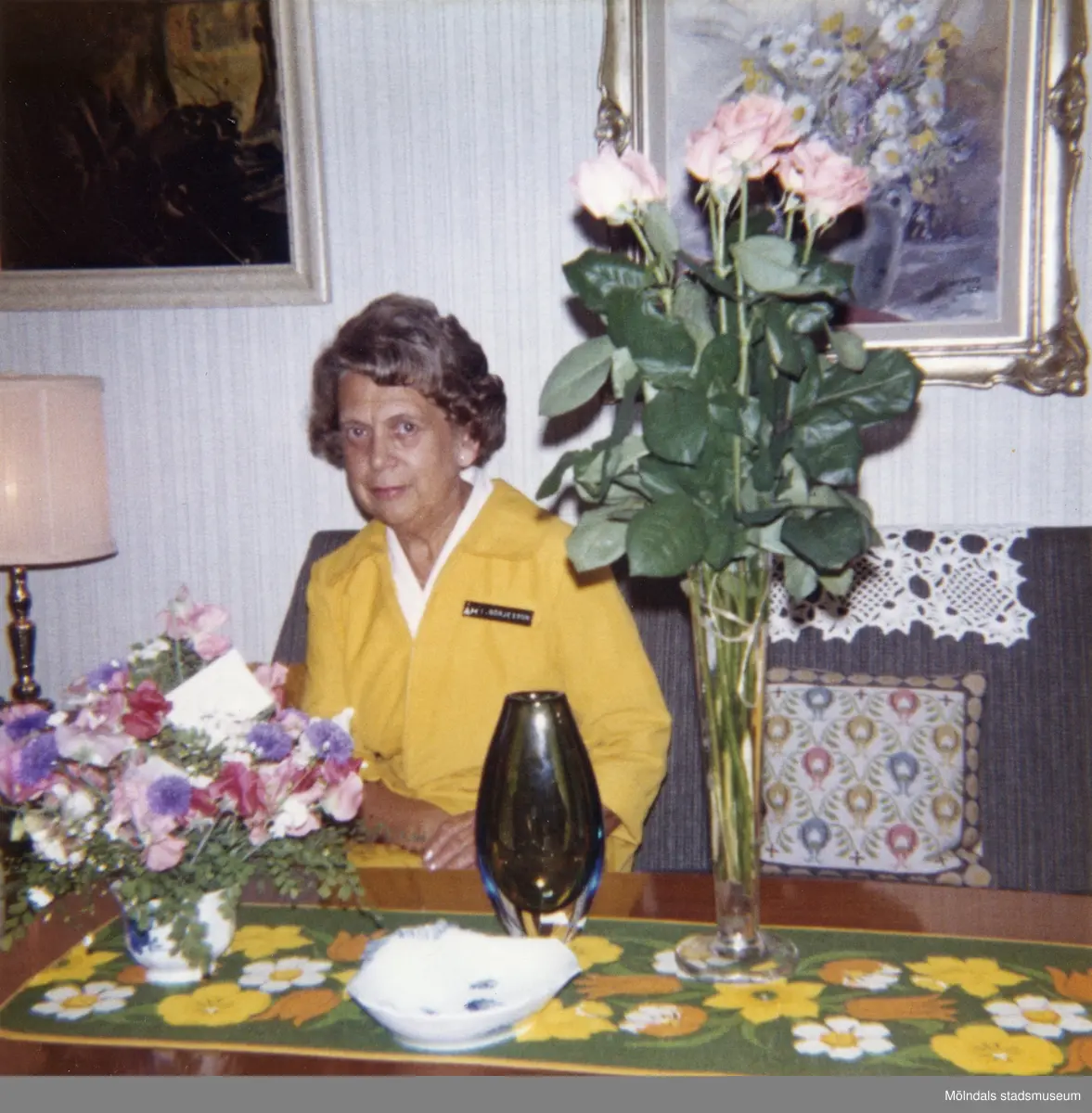 Inga-Lill Börjesson slutar sin anställning på Tempo juli 1975. Hon har sin rock med namnskylt på. Glasvasen var en present från Tempo.