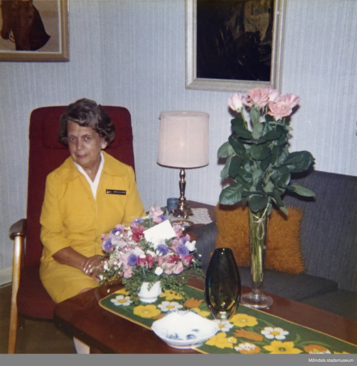 Inga-Lill Börjesson slutar sin anställning på Tempo juli 1975. Hon har sin rock med namnskylt på. Glasvasen var en present från Tempo.