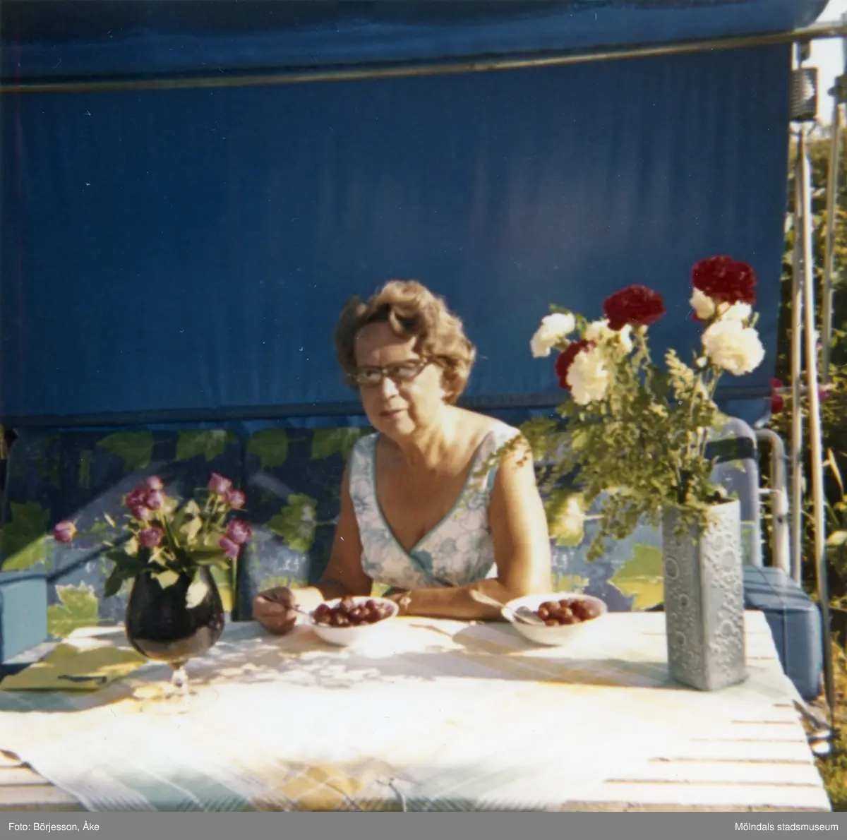 Inga-Lill Börjesson i trädgården. 25-årig bröllopsdag.