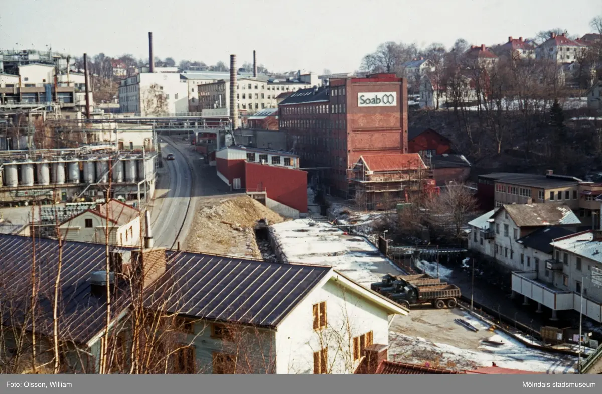 Kvarnbygatan österut, okänt årtal. I förgrunden: takåsar till byggnader vid Gamla Torget samt Götiska Förbundets friskola. Till vänster: Soabs industriområde. Till höger, uppifrån: "Strumpan" (Kvarnbygatan 10-14), Ahlafors textilindustri (Carlsberg) samt Stora Götafors på Götaforsliden.