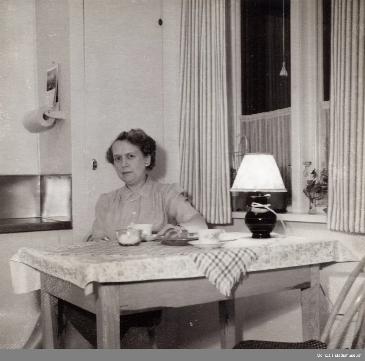 Inga-Lill Börjesson vid köksbordet på 1950-talet. Fotografi innan kylskåp installerats. Se även MMF2013:0049.