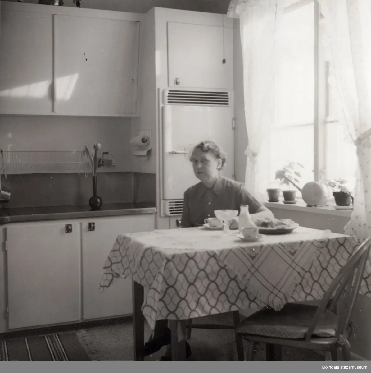 Inga-Lill Börjesson vid köksbordet på 1950-talet. Fotografi efter kylskåp installerats. Se även MMF2012:0048.