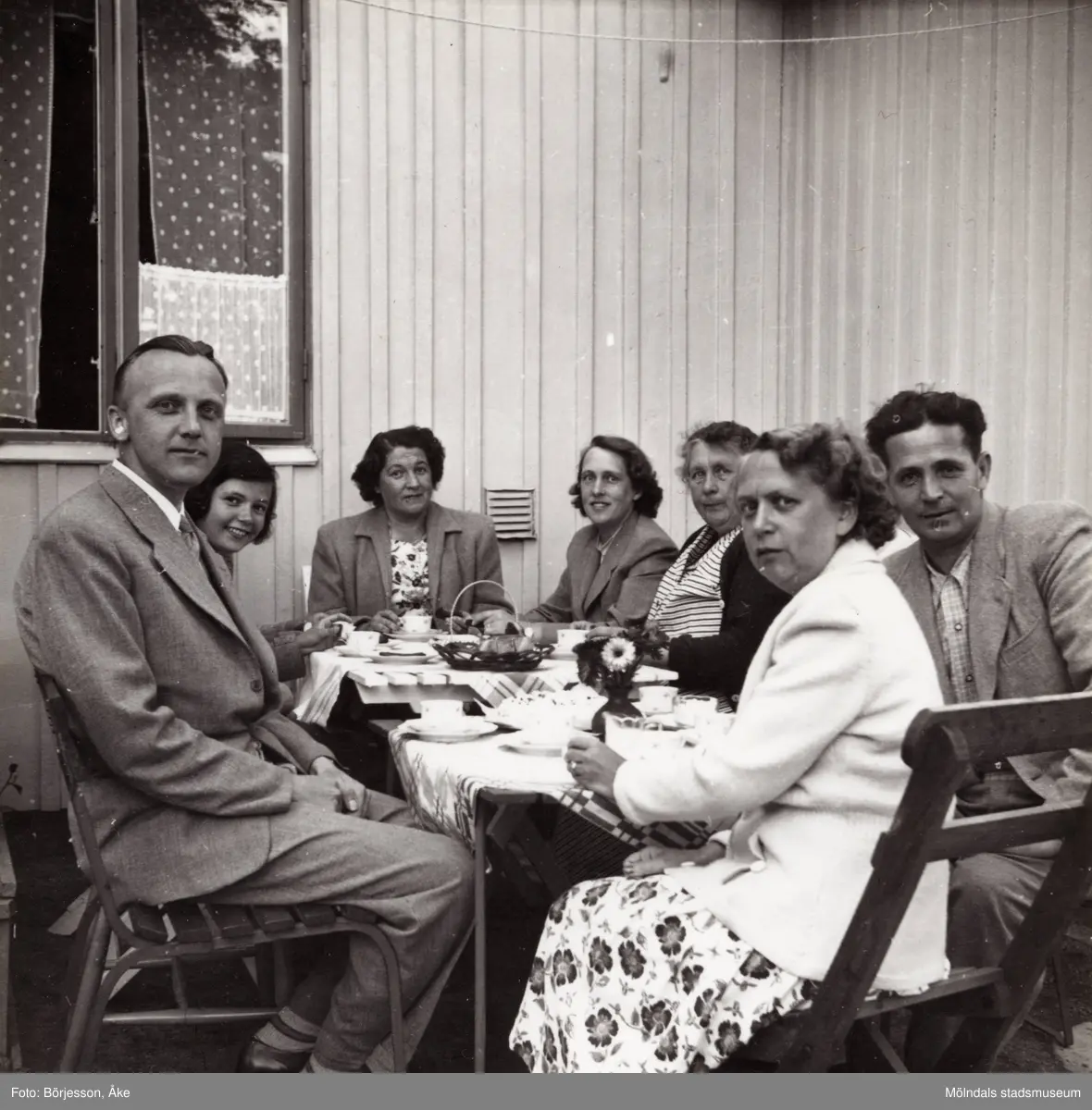 Solhemsgatan 10, utanför köksfönstret 1954. Inga-Lill Börjesson tillsammans med släktingar: svåger Göte Cedstrand, systerdotter Rita Fernlund, syster Linnéa Fernlund, syster Maj-Britt Cedstrand, mamma Emma Dahlberg och svåger Sven Fernlund.