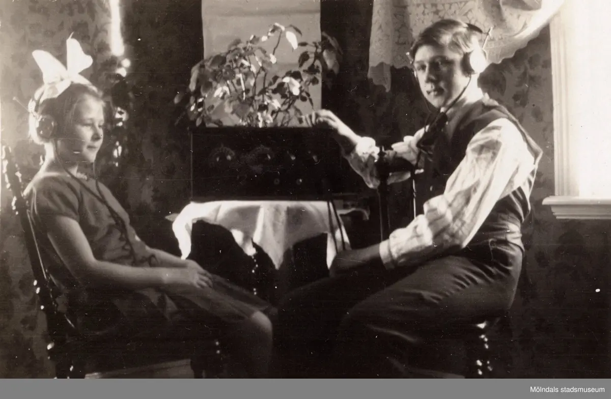 Åke och Elna Börjesson sitter och lyssnar på radio. Fotografi ur album som tillhört Hilda Börjesson Hallgren.