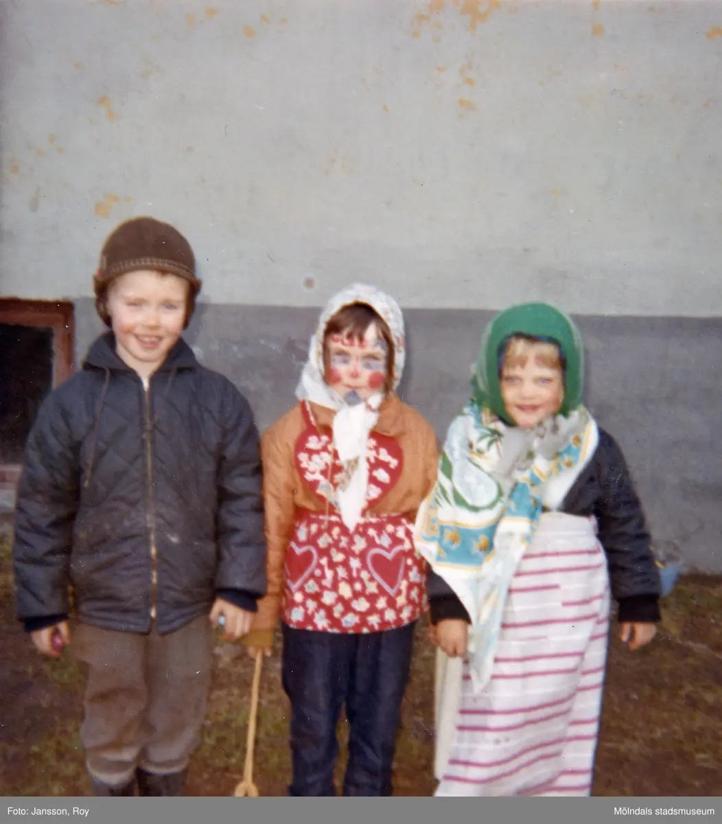 Tre påskklädda kompisar, Jörgen Larsson, Ilse Jansson och Åsa, står uppställda utefter en vägg år 1965. De bodde på Krokslättsgatan 3 i Mölndal.