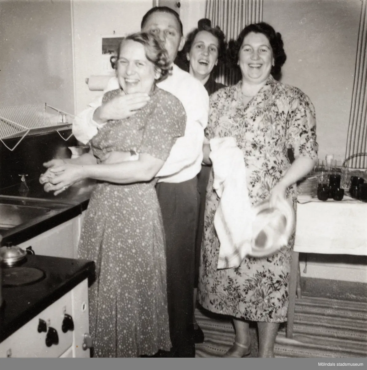 Köket på Solhemsgatan 10 efter 1948. Inga-Lill och Åke Börjesson tillsammans med Inga-Lills systrar Maj-Britt och Linnéa.