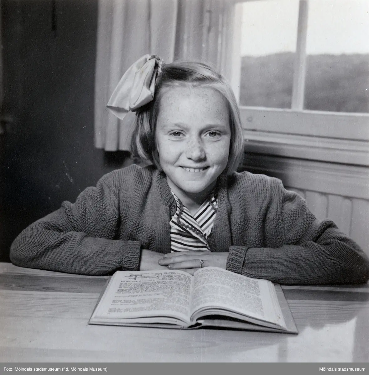 Ninnie Johansson (gift Martin) sitter vid sin skolbänk i Krokslättsskolan år 1949. Hon gick då i 5:e klass. Hennes familj bodde i en lägenhet som låg mittemot skolan, strax utanför skolgården.