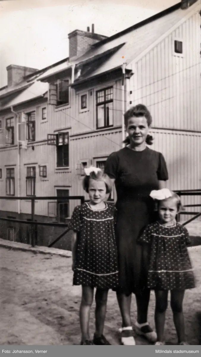 Fabriksarbeterskan Sonja Johansson (1908 - 1977) står med döttrarna Ninnie (f 1937) och Britt-Marie (1939 - 2004) framför sig, år 1943. I bakgrunden ses Gustavsberg 3. Sonja sydde alltid flickornas klänningar, och dessa som är med på bild var röda med vita prickar på.