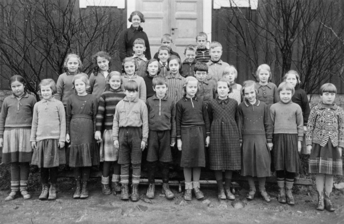 Flickor och pojkar stående framför gamla Sinntorpskolan.