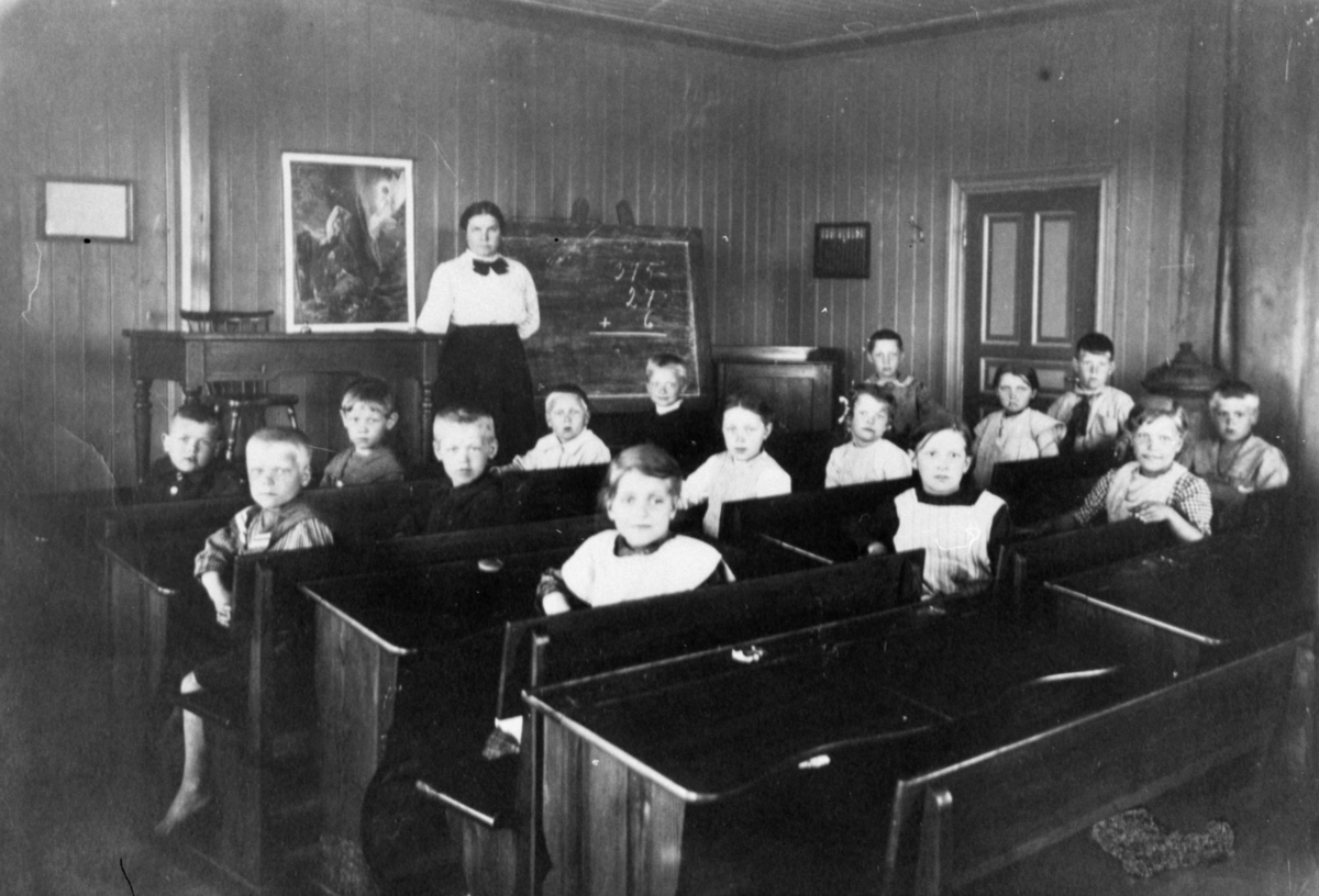 Flickor och pojkar sittande i skolbänkar i Rantorpsskolan i Lindome. Fröken stående vid katedern.