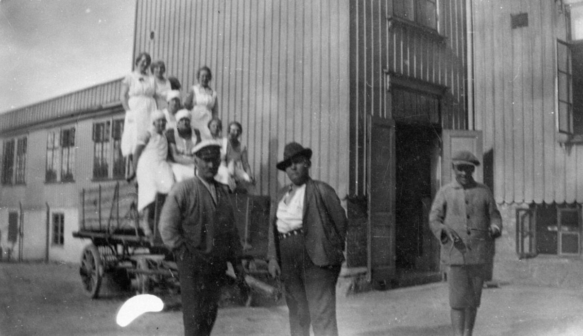 Utanför ingången till Kärra Hökegård med isoleringen i bakgrunden. Flickorna sitter på vagnen med vattenkaret som forslade vatten till hemmet. Framför står fr.v. KnekteKlas med vit mössa, Morgan från Toltorpsdalen och Hjalmar från Stensjöbacke. Alla tre intagna.